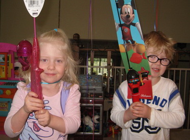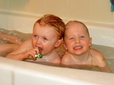 1. "The pink one here is Amelia's." 2. Fun in the tub! 1 & 2. The twins were 4 on May 8th. Happy Birthday, guys! 1. "See what we got for our birthday!" 2. "Come a little closer, we want to show you something!"