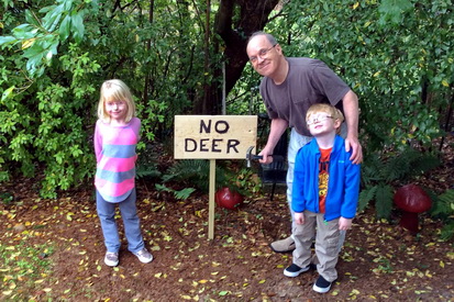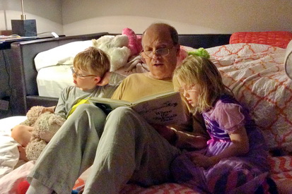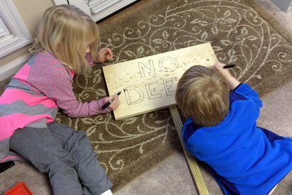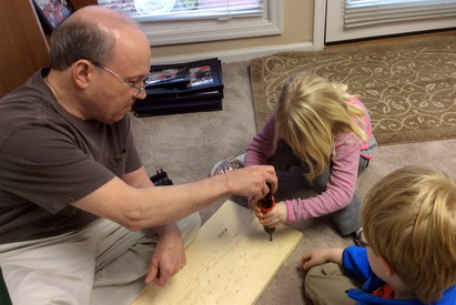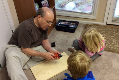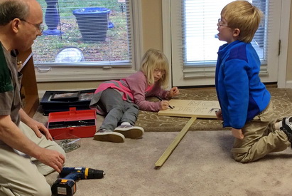 1 & 2. Grandpa shows twins how to drill, hammer and saw. 1 & 2. Twins help make a sign for Grandma Sue. 1. All done, but we found out that deer can't read! 2. Grandpa reads to the twins before bedtime.